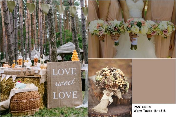 A representação da natureza é uma tendência cada vez mais marcada nos casamentos e, no próximo 2017, irá converter-se num must imprescindível na decoração nupcial. Para isso, a cores mais naturais como esta, adquirem uma importância relevante nestes românticos espaços, posicionando-se no top das cores tendência para casamentos desta temporada. De essência tranquila e estável, esta tonalidade Warm Taupe dará origem a uma decoração única e totalmente enquadrada nos componentes mais naturais da nossa terra. Ainda que estilos como o vintage e o boho poderão acolher a inconfundível serenidade desta cor, na decoração de casamentos rústicos, o Warm Taupe em combinação com outros tons neutros como o branco e verde, ou com outras cores naturais, como o cobre ou o verde, oferecerá um resultado único e impecável.