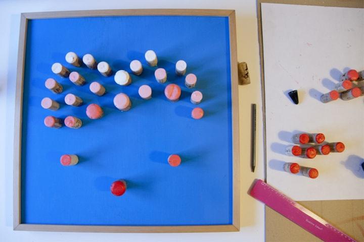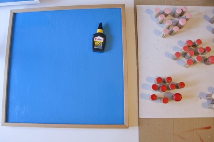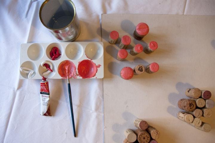 Pinta a ponta irregular das rolhas de cortiça, tendo cuidado para não ultrapassar as bordas com excesso de pintura. O lado plano e branco é o mais indicado para colar ao suporte. Vamos precisar de 10 rolhas pintadas de branco, 10 de cor-de-rosa claro, 10 de cor coral, 10 de vermelho claro e finalmente 10 de mangenta puro.