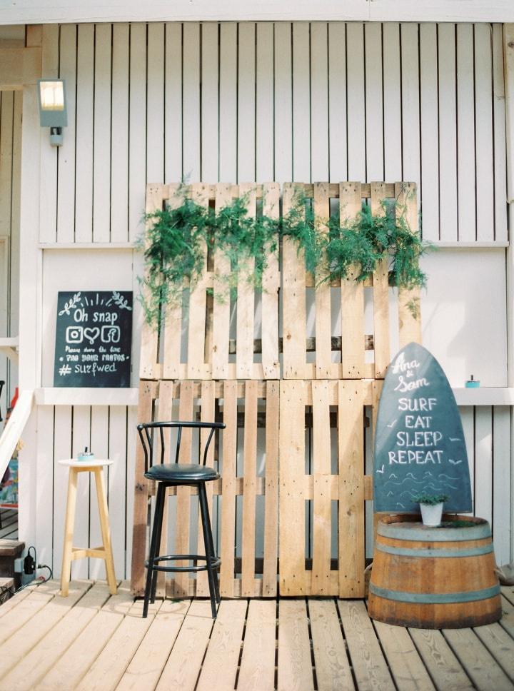A praia é, por si só, um cenário idílico para a celebração de uma data tão especial, por isso, os noivos não têm de se esforçar demasiado com a decoração do espaço envolvente. A nossa primeira recomendação é que optem precisamente pela simplicidade. Vais ver que o teu vestido de noiva com renda já vai compor o quadro final e ficar lindíssimo nas fotografias! Mas porque todos somos adeptos de um bom efeito surpresa, e se tu e o teu noivo têm esse estilo aventureiro e irreverente, coloquem uma prancha de surf ou longboard na vertical, fixada na areia, e escrevam nela o que desejarem – o vosso nome, uma mensagem de boas vindas ou a hora em que vão cortar o bolo de casamento original!