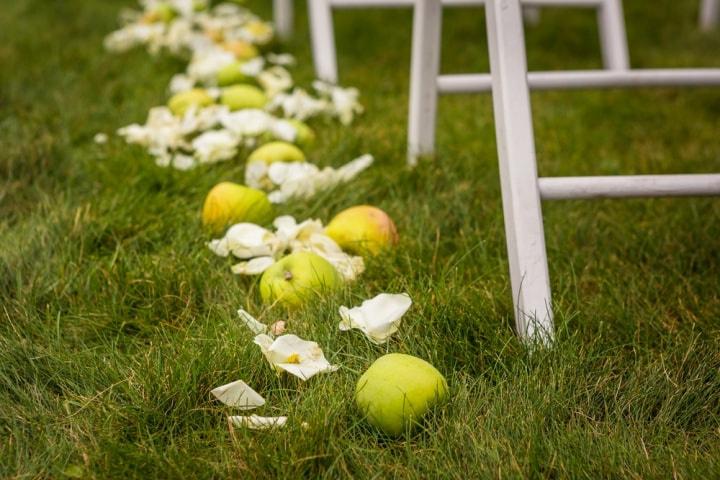 A recepção é o primeiro espaço da festa onde podes usar a fruta como elemento decorativo. Por exemplo, prepara um caminho adornado por flores e frutas onde logo desfilarás com o teu vestido de noiva com renda. O resultado vai ser ultra romântico, sobretudo se tens idealizado um casamento rústico. Logo, usa a fruta para decorar mas também para ser comida: oferece espetadas coloridas para os teus convidados se refrescarem, ou encomenda algumas esculturas de fruta! Finalmente, usa uma peça de fruta para indicar a cada convidado a mesa que lhe corresponde. Não achas que esta composição pode resultar num placard super original?