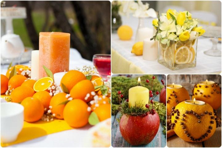 As frutas, com as suas cores chamativas e formas variadas, são perfeitas para decorara os centros de mesa. É muito importante que escolhas frutas que não destoem da época do ano, a menos que necessites de uma grande variedade para dar os nomes às mesas (o que seria uma ideia igualmente interessante). Combinar frutas de diferentes formas com ramagens, velas e jarras, permite-te fazer composições muito criativas. Finalmente, podes ainda fazer pequenos arranjos com frutas que usarás para decorar recantos específicos no espaço da festa (como, por exemplo, o local onde repousará o vosso bolo de casamento).