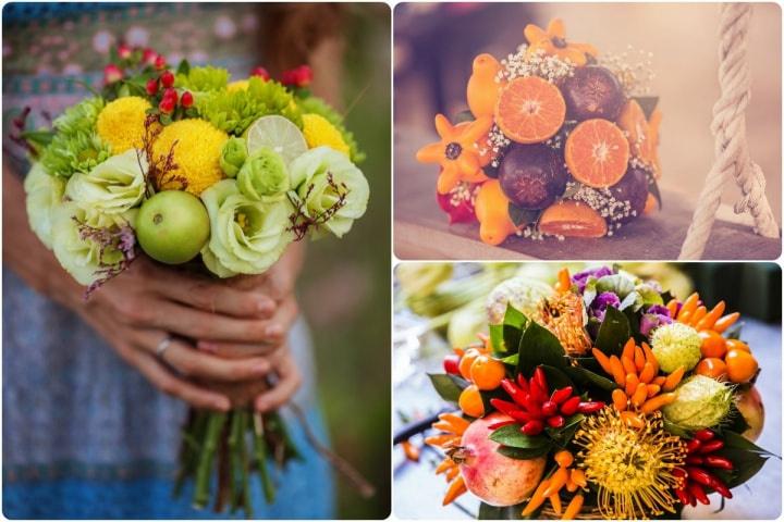 Maçãs, romãs, laranjas, clementinas, limões, peras ou até morangos... Todas estas maravilhosas frutas podem fazer parte do teu ramo de noiva! Não precisas, obviamente, de levar o bouquet com fruta ao limite, mas a verdade é que usar algumas peças, de forma sútil, dá um toque muito original ao ramo! Pequeno pormenor: há que ter cuidado no momento de atirar o ramo às amigas solteiras! Para o tornar mais leve, podes simplesmente optar por adicionar alguns ramos de groselhas para um toque de vermelho paixão! Perfeito para combinar com um vestido de noiva simples e leve!