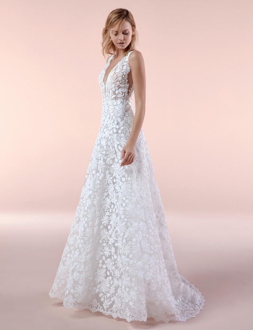 Nesta coleção repleta de formosura, o corte princesa é o predileto. Assim, as saias fluídas e adornadas com tule e mikados resplandecentes são uma constante, compondo visuais elegantes e com um irresistível toque dreamy. Para completá-los, os decotes profundos - tanto frontais como nas costas - fazem as delícias às noivas antes do efeito tattoo lace e dos bordados florais.