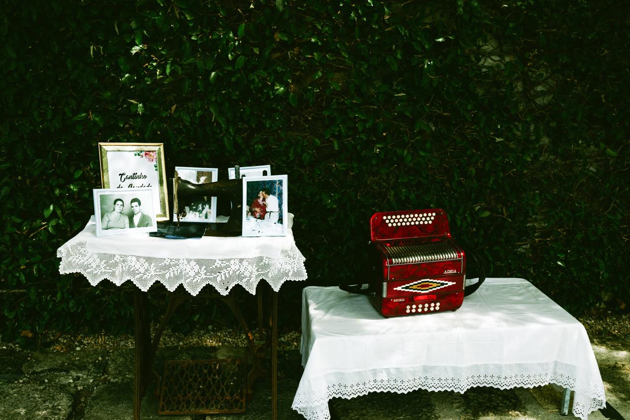 A mesa de doces e mesa do livro de assinaturas pedem elementos únicos e originais e, nos casamentos de estilo retro ou vintage, os objetos antigos são os responsáveis por esse toque único e personalizado. Além das máquinas de escrever, telefones antigos, relógios e caixas de som, são apenas alguns exemplos dos elementos que podem compor as mesas do local. Baús antigos ou malas de couro antigas também podem dar um toque à decoração ou mesmo servir de apoio para as lembranças, por exemplo. Peças assim deixam qualquer ambiente com muita personalidade aos olhos dos convidados.