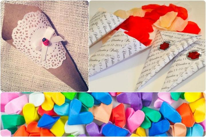Cada vez mais usados para distribuir o arroz pelos convidados podem ser feitos com cartão, papel de jornal ou qualquer outro que vos chame a atenção. Podem usar alguns carimbos e criar pormenores muito interessantes. E além do arroz e das pétalas, se encontrarem um furador em forma de coração, inundam a vossa saída da igreja de confettis!